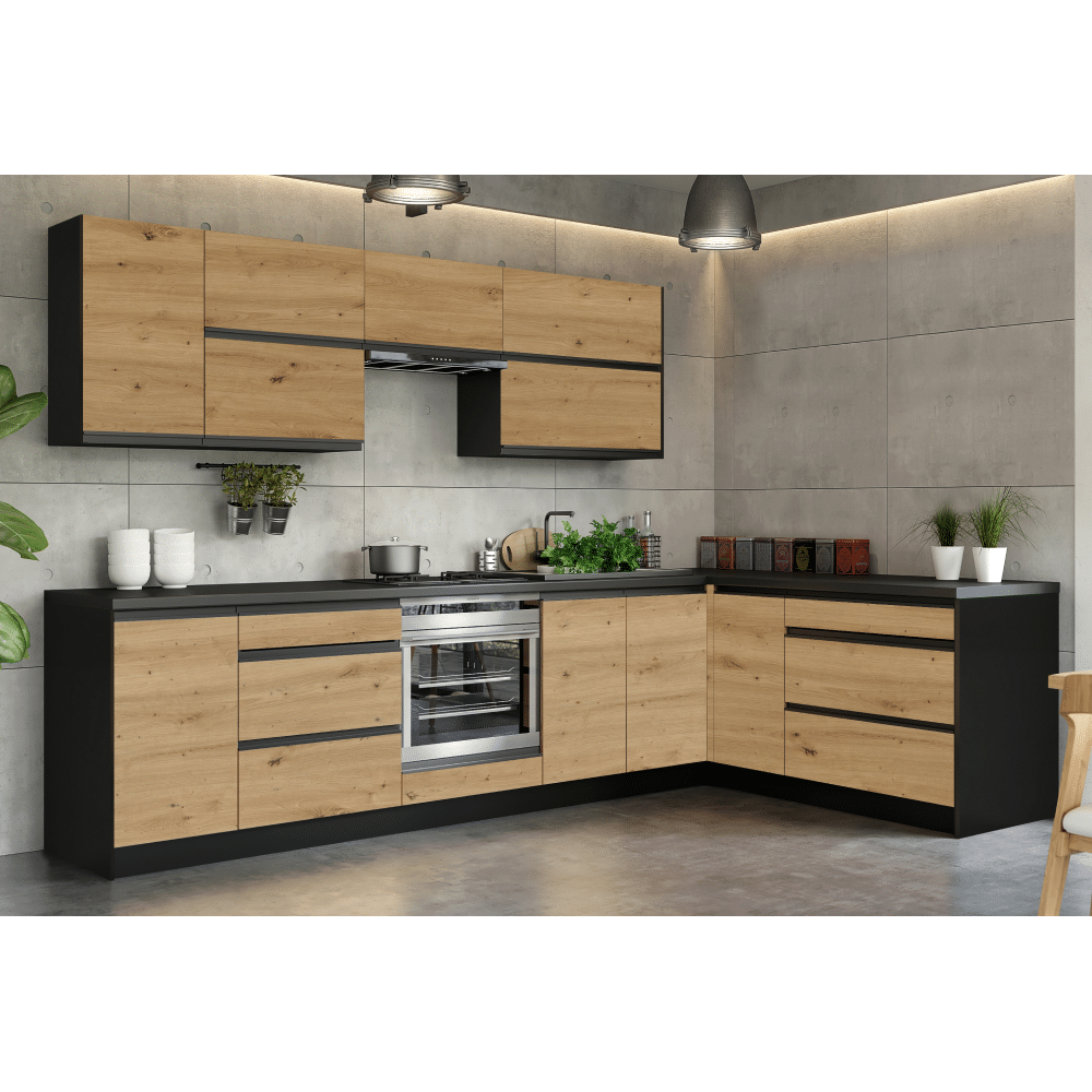 Rohová univerzálna kuchynská linka 300×180, dub artisan/čierna, BRECK