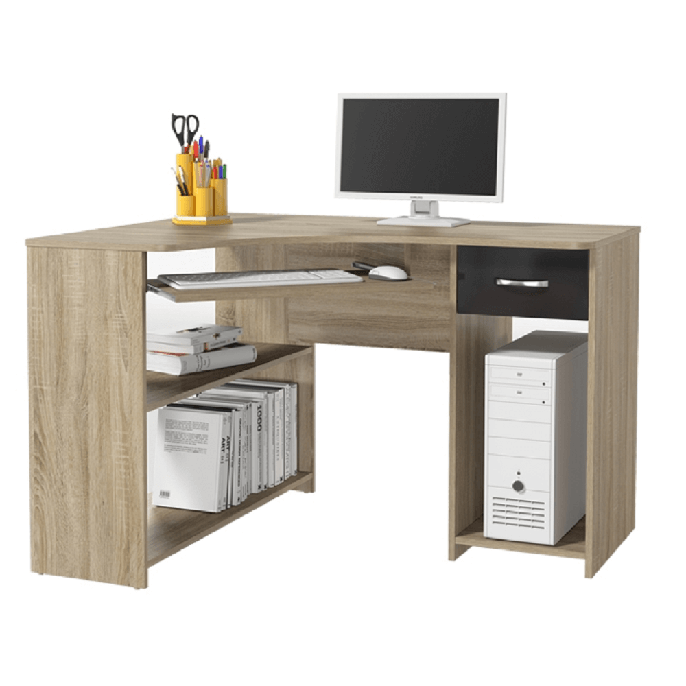 Rohový PC stôl, dub sonoma/čierny lesk, UMAG
