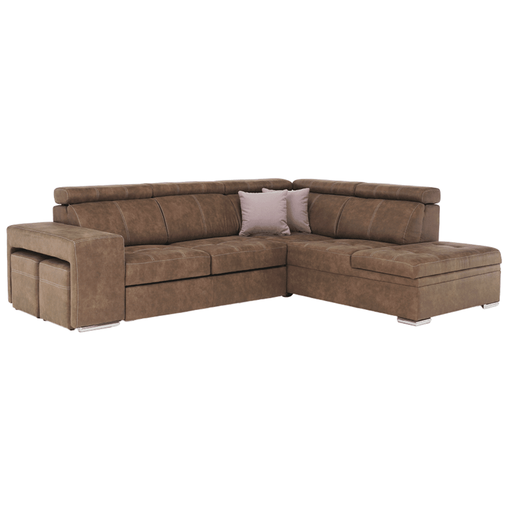 Celočalúnená rohová rozkladacia sedacia súprava s úložným priestorom a s polohovacím záhlavím.
