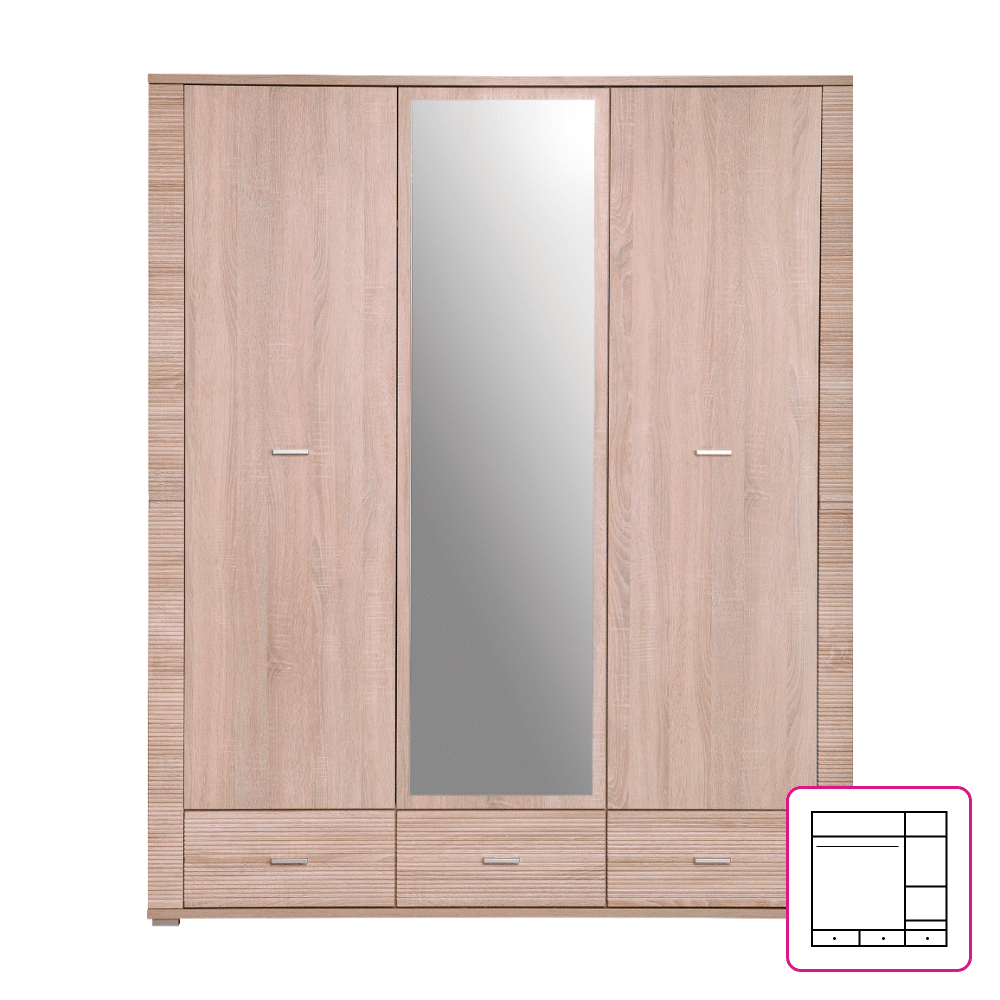 Skriňa vešiaková typ 02, s troma policami a troma zásuvkami, vhodná na zariadenie spální, materiál: DTD laminovaná. Hrany jednotlivých komponentov sú ukončené vrúbkovanou lištou. Farebné prevedenie: dub sonoma. Rozmery (ŠxVxH): 160,8x192x55 cm. Dodávaná v demonte, len na objednávku s dodacou lehotou 4-6 týždňov.