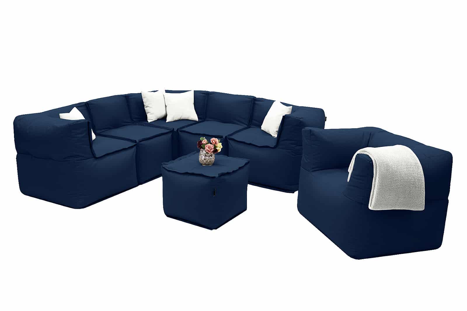Sestava obsahuje: 3x Záhradný textilný rohový diel MODULTEX (tmavo modrá), 2x Záhradný textilný stredový diel MODULTEX (tmavo modrá), 1x Záhradné textilné kreslo MODULTEX (tmavo modrá), 1x Záhradný textilný stolík/taburet MODULTEX (tmavo modrá)