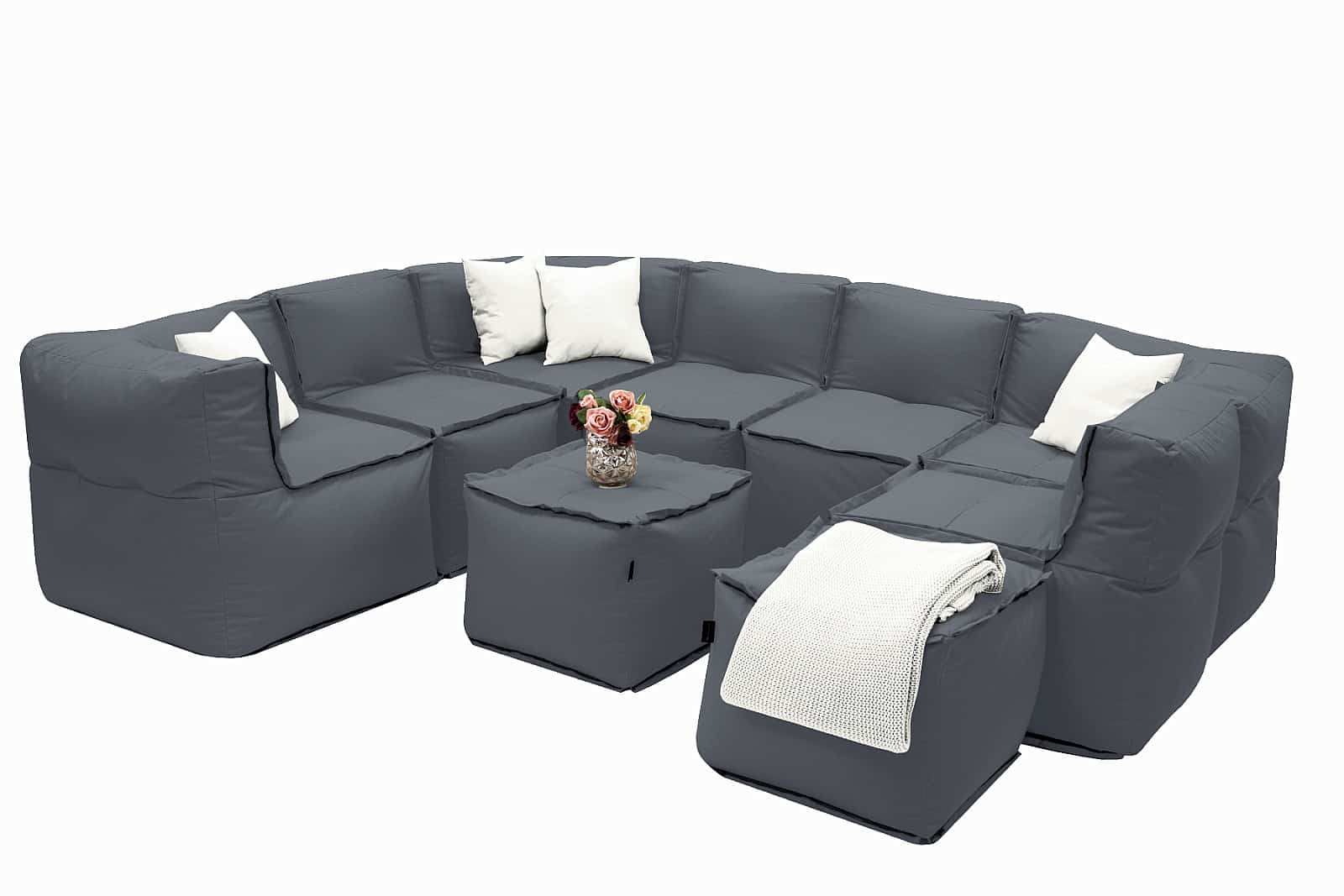 Sestava obsahuje: 3x Záhradný textilný rohový diel MODULTEX (sivá), 4x Záhradný textilný stredový diel MODULTEX (sivá), 2x Záhradný textilný stolík/taburet MODULTEX (sivá)