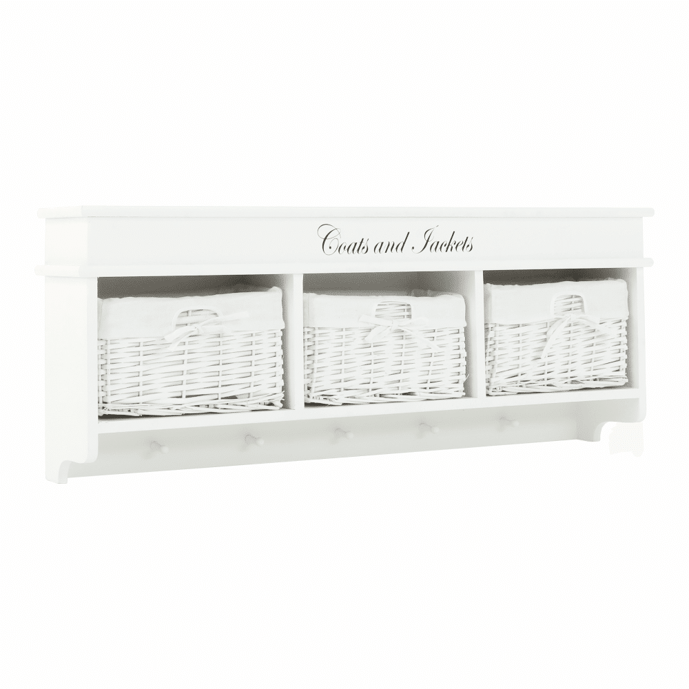 Vešiak BLANCO s tromi prútenými košíkmi.