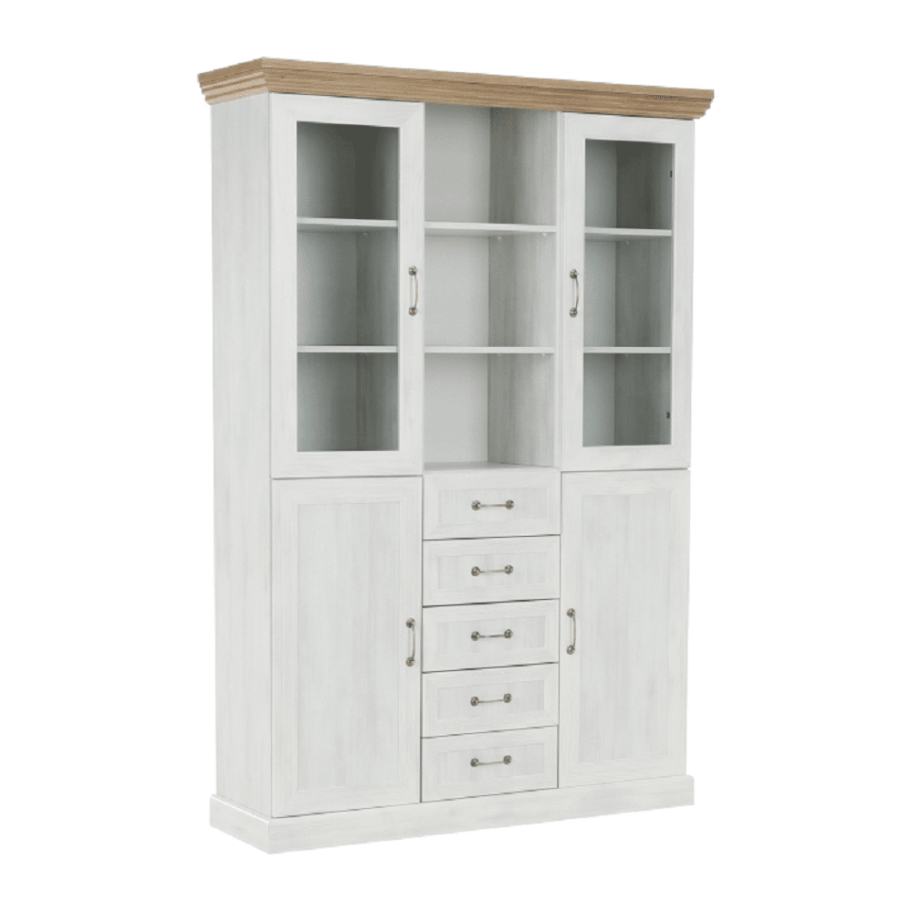 Vitrína W2D, štyri skriny, päť šuplíkov, otvorený úložný priestor s policami z elegantného sektorového systému Royal v provensálskom štýle.