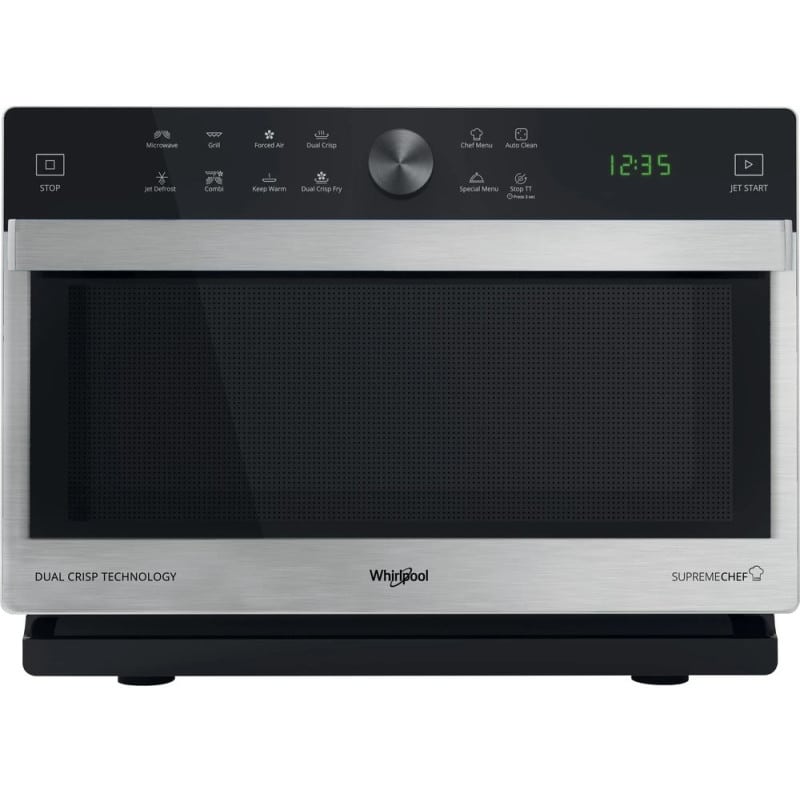 mikrovlnná rúra, displej, elektronická, 3D systém, Crisp tanier + rukoväť, Jet Grill, Jet Start, Jet Defrost, horúci vzduch, Bread defrost, 33 l, nerezový interiér, priehľadné sklo, otočný tanier, vyčnievajúca rukoväť, vnútorné osvletlenie, otváranie – dolné závesy, Výkon mikrovĺn/ grilu: 900 W /1200 W, nerez